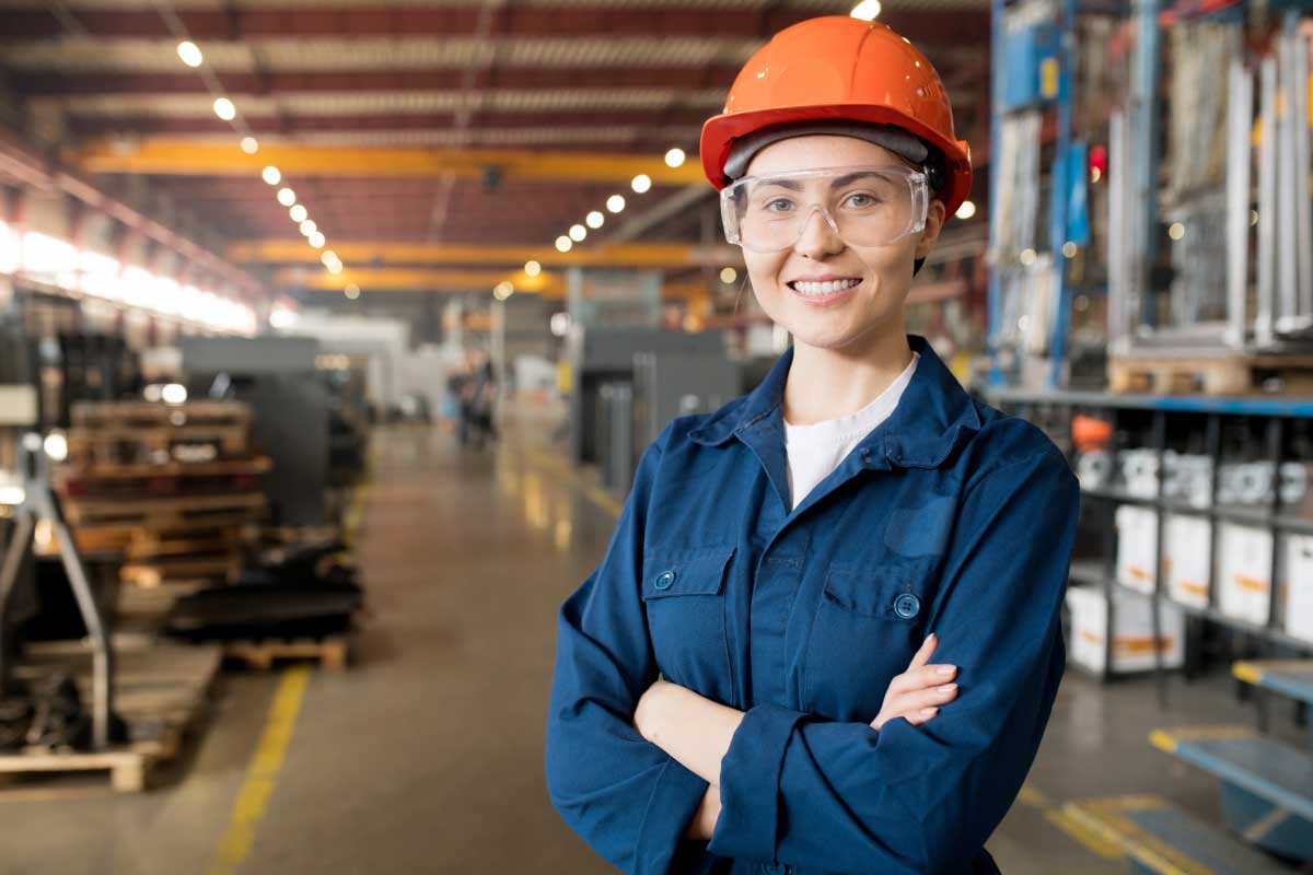 A confident worker wearing safety gear, standing in a manufacturing facility, representing workplace safety, operational excellence, and professional empowerment in industrial settings.