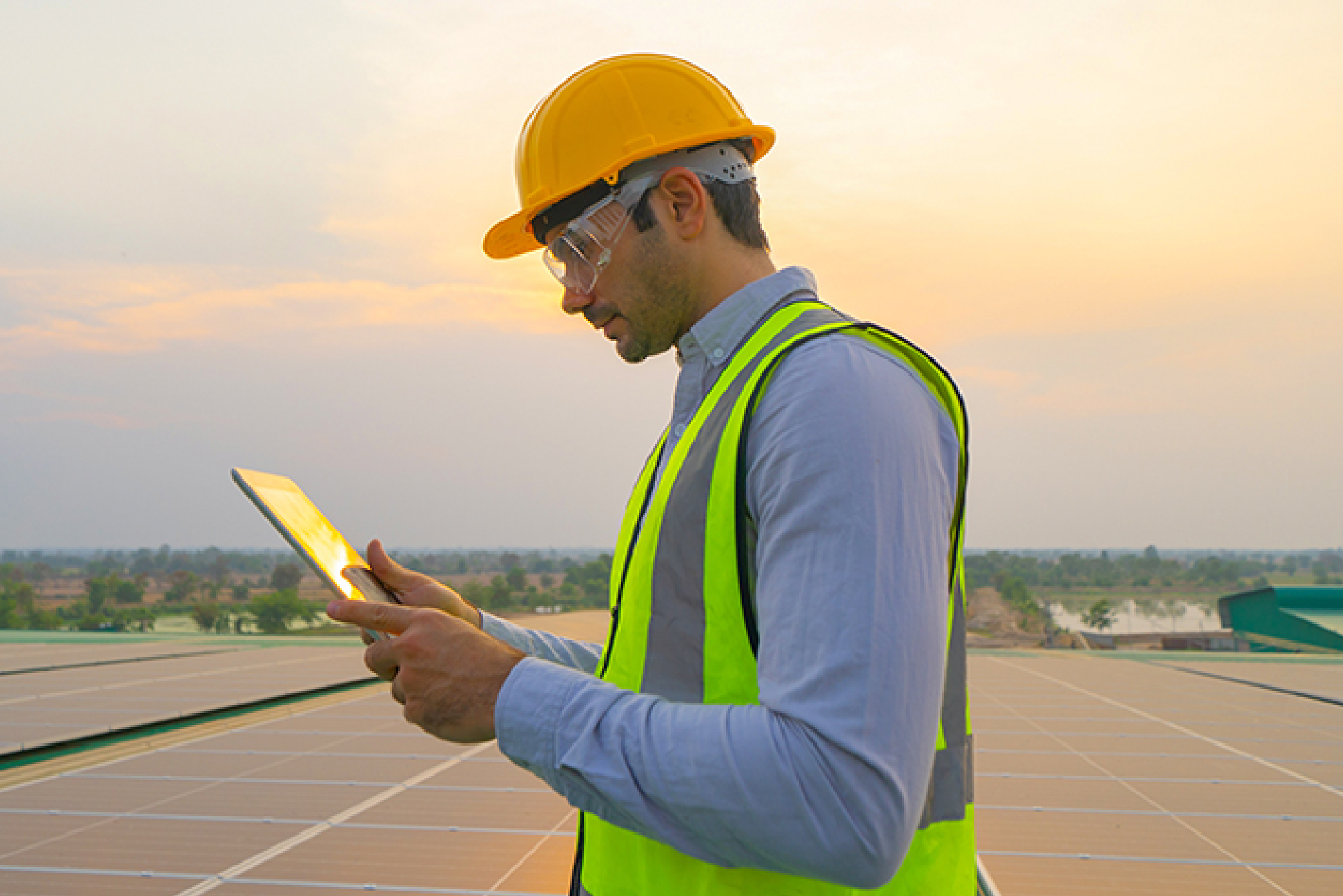 A solar engineer wearing a yellow hard hat and reflective safety vest inspects a solar farm using a digital tablet at sunset.