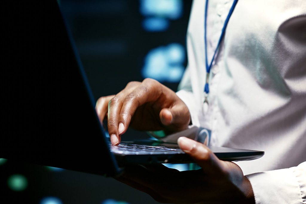 Close-up of a person typing on a laptop, highlighting technology and digital operations in a modern workspace.