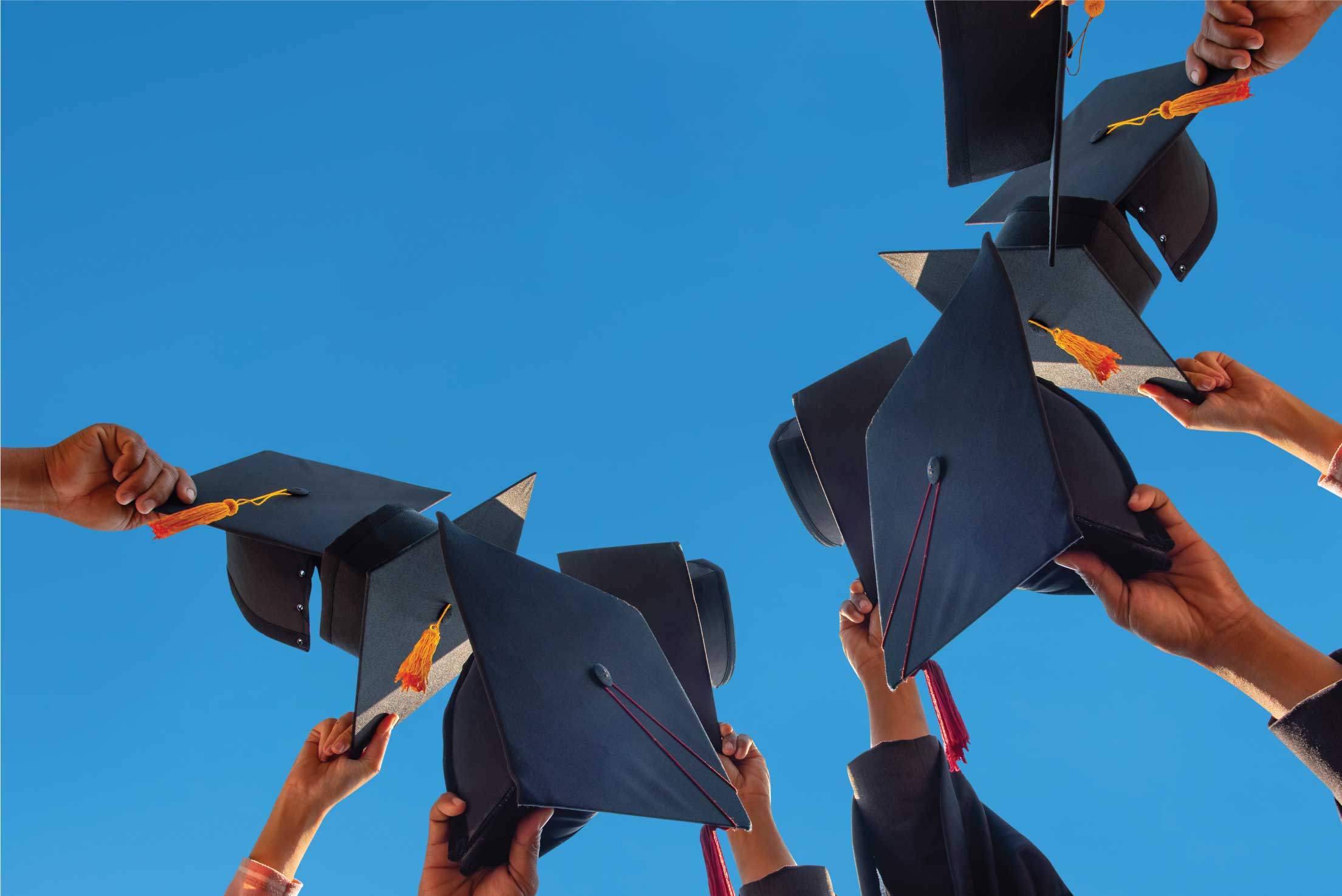Graduates holding up their caps against a bright blue sky, celebrating academic achievement and success.