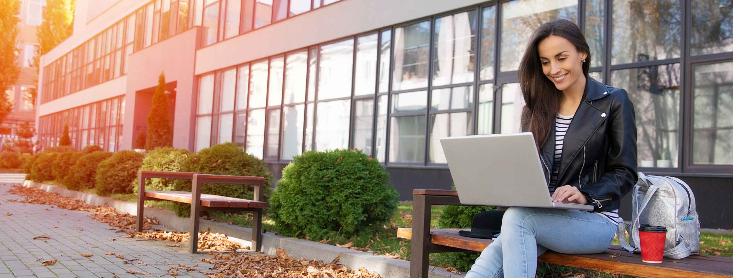 A young woman sitting on a wooden bench outdoors, using a laptop and smiling.