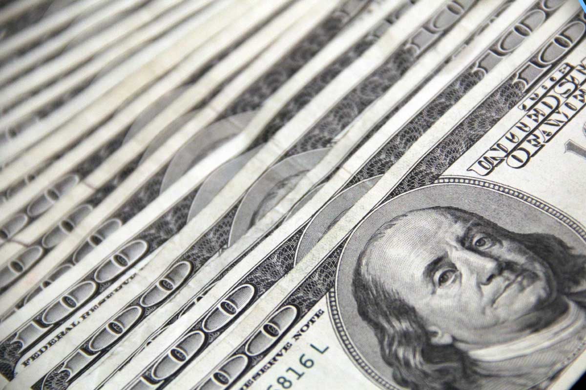 Close-up of stacked $100 bills featuring Benjamin Franklin, representing wealth, finance, or economic growth.