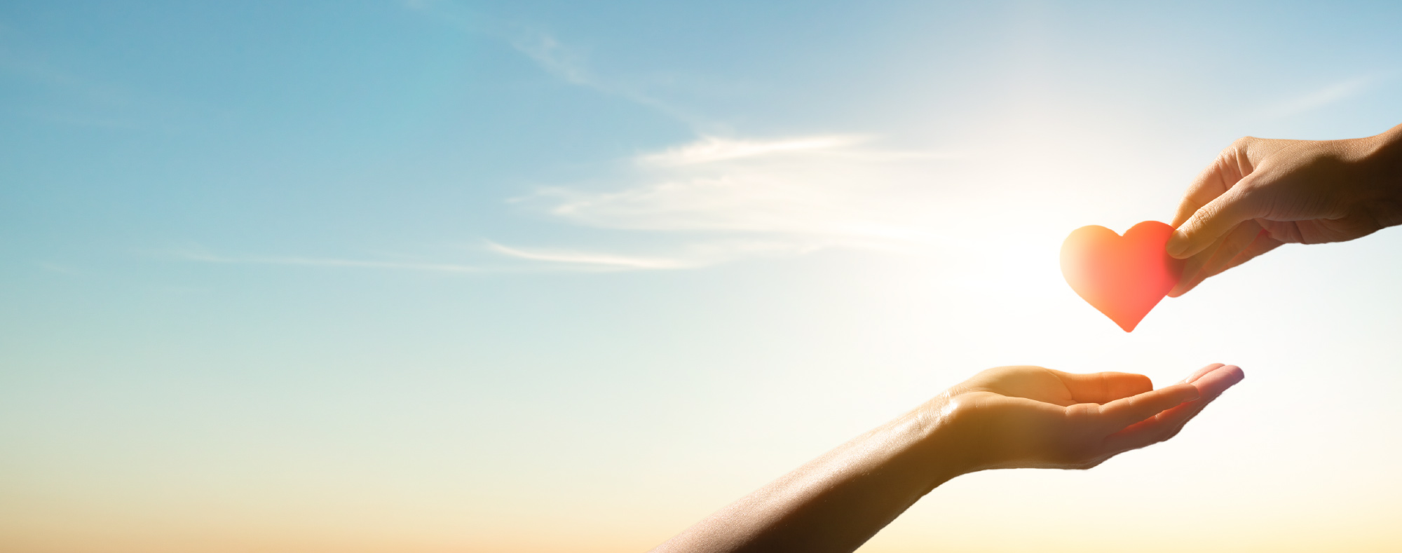 Two hands reaching towards each other in a heart-giving gesture against a bright sky.