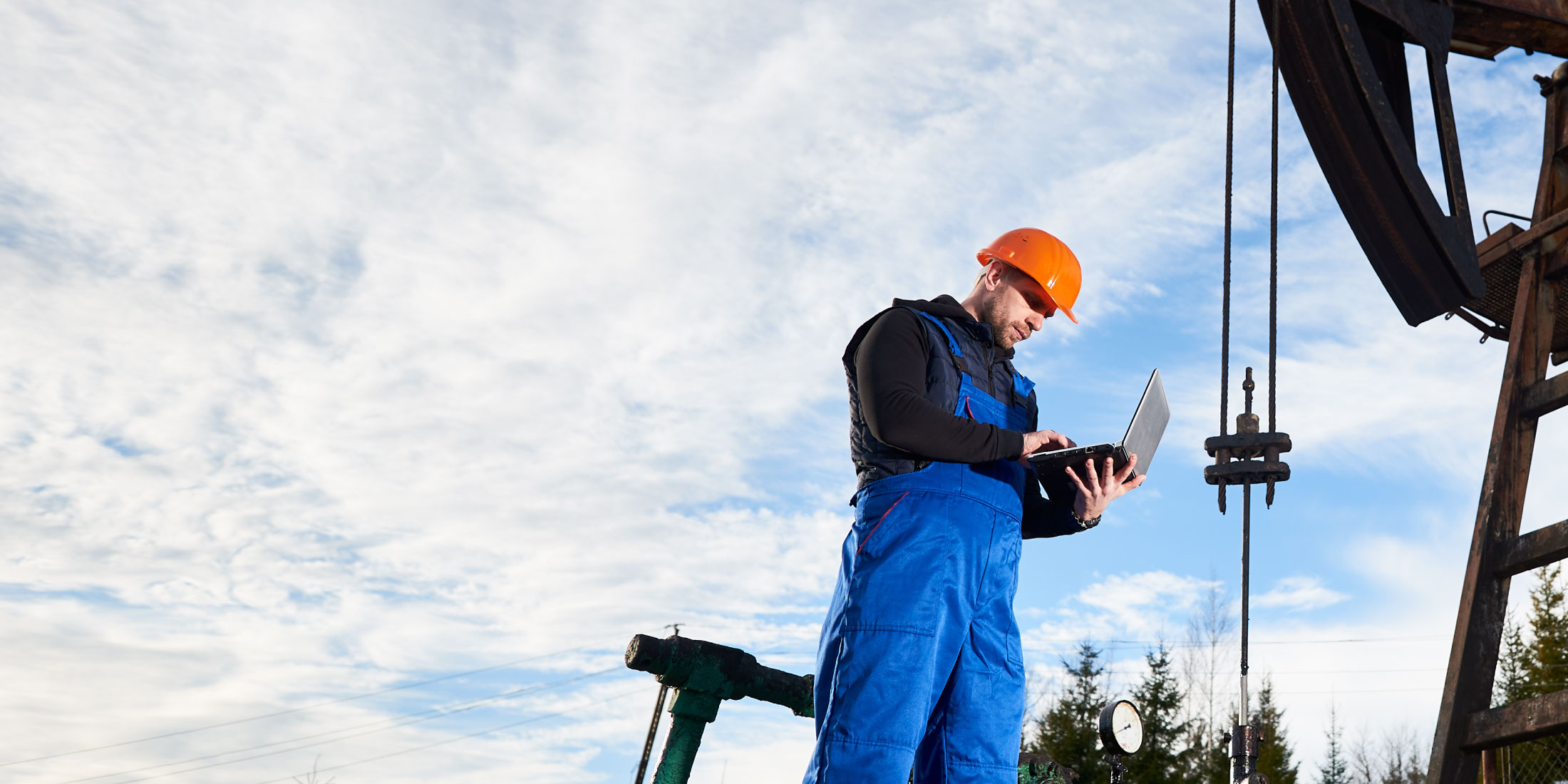 Field worker in a blue uniform and orange hard hat using a laptop outdoors, with industrial machinery in the background, emphasizing technology and field operations in the energy sector.