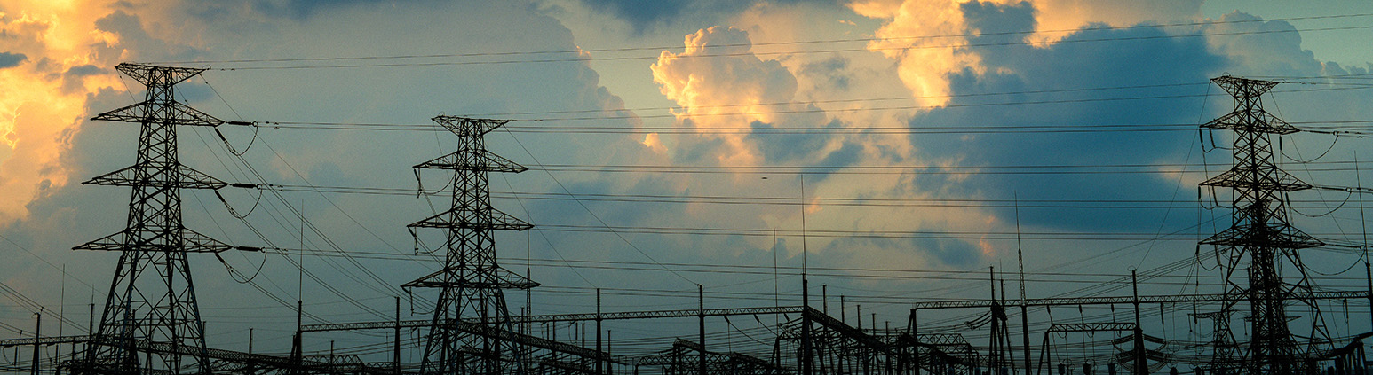 Silhouetted high-voltage power transmission towers against a dramatic sky with clouds illuminated by the warm colours of sunrise or sunset.